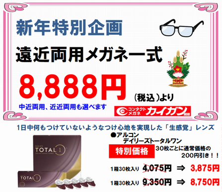 新春、遠近両用メガネ8,888円セールと、アルコントータルワン特別価格キャンペーン実施します!!