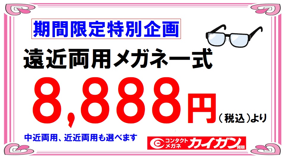 遠近両用メガネ一式を末広がりの8,888円(税込)よりご用意いたしました。